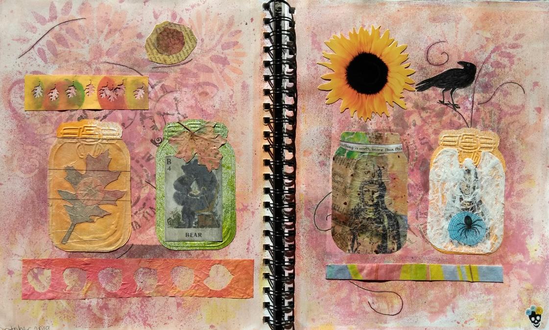 | My October 2019 Art Journal Spread "What I've Preserved" Tim Holz die-cut Mason Jar. Background: stencils and Marabu Mixed Media acrylic Art Spray. Crow stamp.